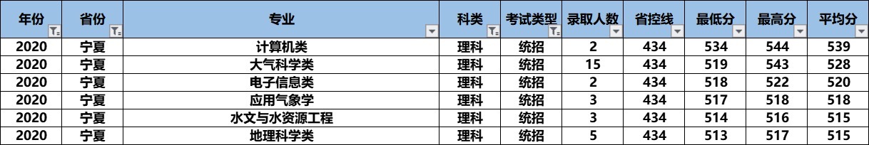 17、南京信息工程大学宁夏2020年理科专业录取数据: