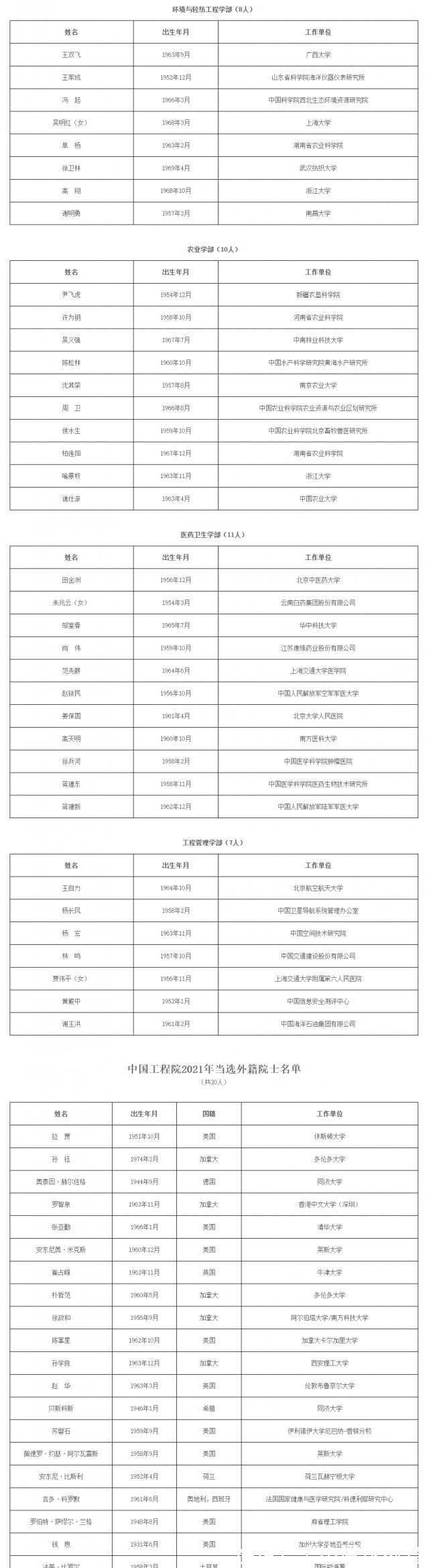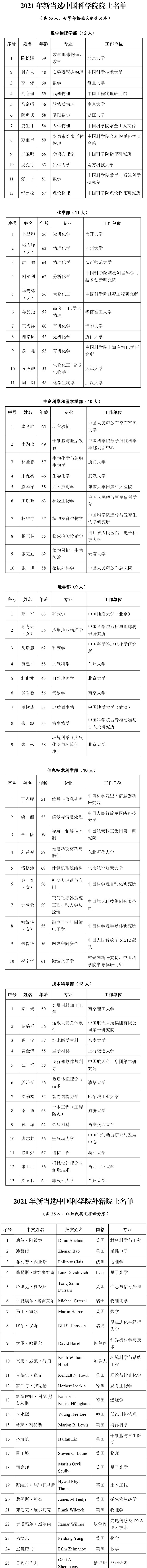 此外,2021年中国科学院新当选外籍院士25人,分别来自11个国家,韩国和瑞士首次有科学家当选中国科学院外籍院士;中国工程院新当选外籍院士20人。本次增选后,中国科学院院士总数为860人,外籍院士总数为129人;中国工程院院士总数为971人,外籍院士总数为111人。